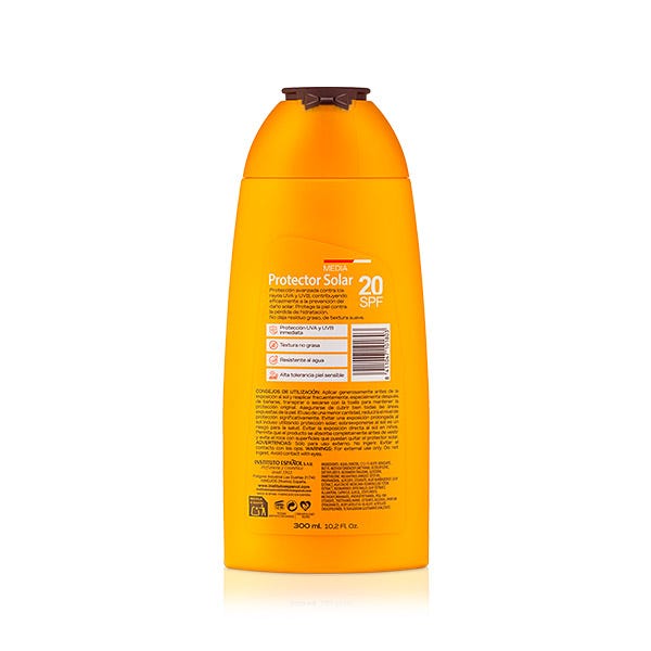 Protector solar media, SPF20, en formato loción 300 ml. Aporta una protección eficaz e inmediata UVA y UVB e hidratación a la piel. Enriquecida con aloe vera, aporta las propiedades que la piel necesita al exponerse a los rayos solares.