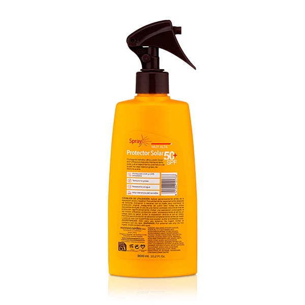 Protector solar muy alta, SPF50+. Aporta una protección eficaz e inmediata UVA y UVB e hidratación a la piel. Su fórmula con alta tolerancia a la piel sensible, textura no grasa y resistente al agua. Enriquecida con aloe vera, aporta las propiedades que la piel necesita al exponerse a los rayos solares. Su textura no grasa y formato spray con pistola favorecen aún más su cómoda aplicación.