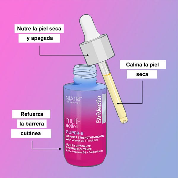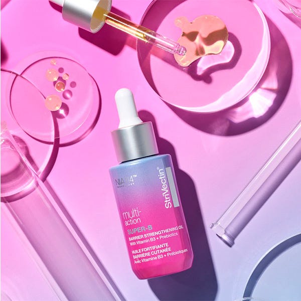 Conoce el gran paso que le faltaba a tu piel. Super-B Barrier Strengthening Oil es un aceite de tratamiento de doble enfoque de StriVectin que apoya el microbioma y la barrera de la piel para atacar los signos visibles del envejecimiento y la piel seca, apagada e irritable.