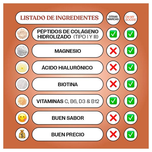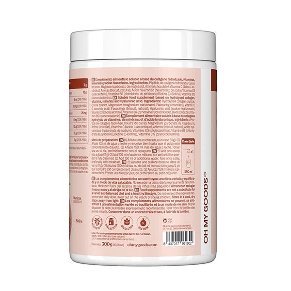 Péptido de colágeno hidrolizado, Cacao en polvo, Magnesio (carbonato de magnesio), Aroma (chocolate), Vitamina C (ácido L-ascórbico), Aromas (biscuit, natural), Ácido hialurónico (hialuronato de sodio), Vitamina D3 (colecaciferol), Vitamina B6 (clorhidrato de piridoxina), Biotina (D-Biotina), Vitamina B12 (clanocobalamina).