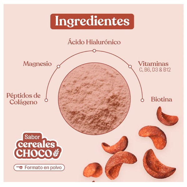 El colágeno más completo con sabor a cereales de chocolate. Una mezcla de péptidos hidrolizados de colágeno tipo 1 y 3 con magnesio y ácido hialurónico que te ayudará a reforzar huesos y articulaciones, además de mantener la elasticidad e hidratación de tu piel.