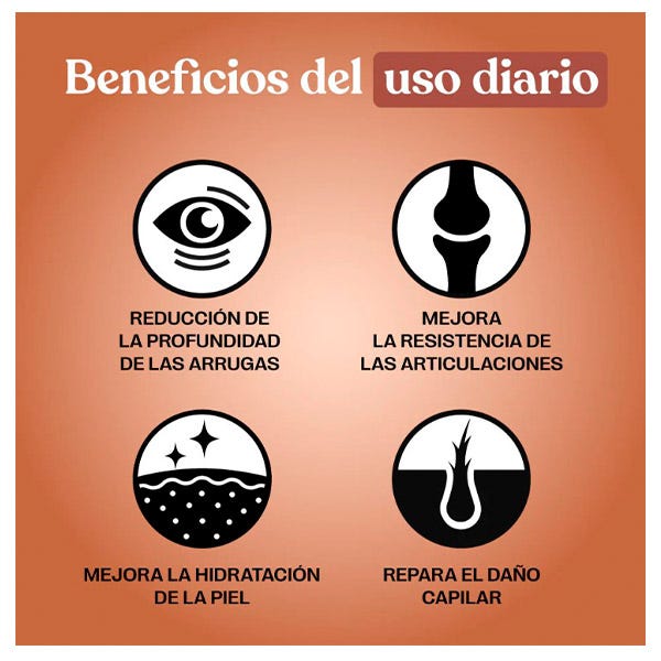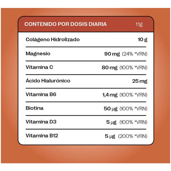 Cada dosis diraria contiene 10g de colágeno. Pero es que además, Super Collagen es tan completo que también te aporta las cantidades que necesita tu cuerpo de Magnesio, ácido Hialurónico y vitaminas C, B2, B6, D3, B12 y Biotina.