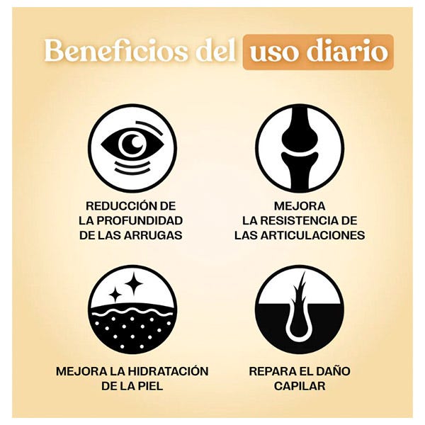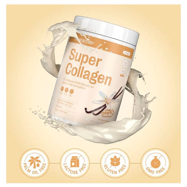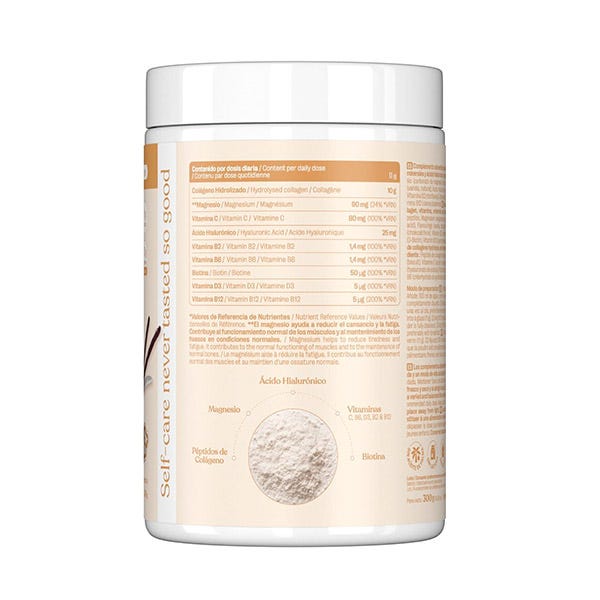 Cada dosis diraria contiene 10g de colágeno. Pero es que además, Super Collagen es tan completo que también te aporta las cantidades que necesita tu cuerpo de Magnesio, ácido Hialurónico y vitaminas C, B2, B6, D3, B12 y Biotina.