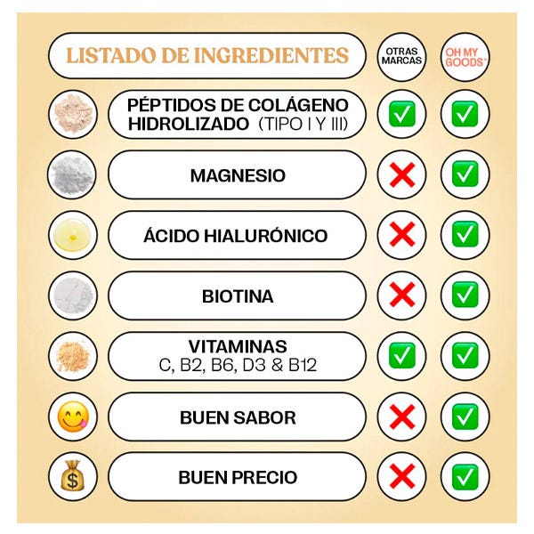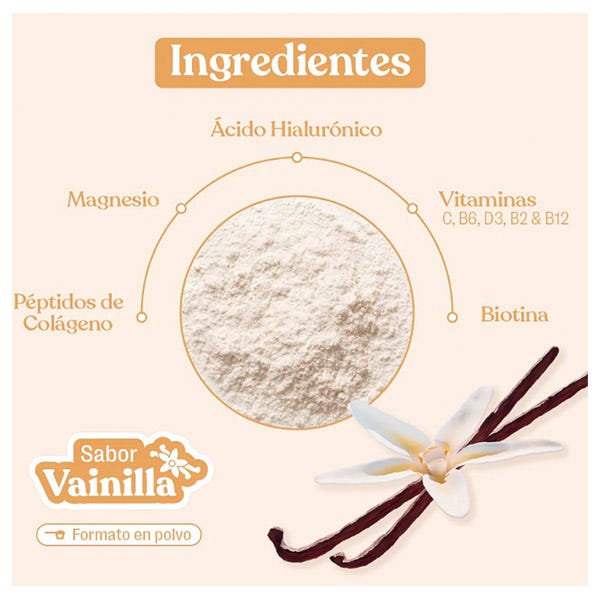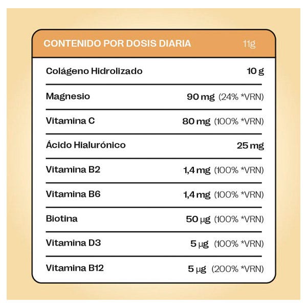 Proteína hidrolizada de colágeno bovino, carbonato de magnesio, vitamina C (L-ascorbato cálcico), ácido hialurónico, vitamina D3 (colecalciferol), vitamina B6 (clorhidrato de piridoxina), biotina (D-biotina), vitamina B12 (cianocobalamina), aromas.