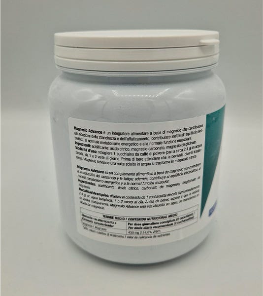 Magnesio Advance 400 es un complemento alimenticio listo para usar a base de sales de Magnesio que contribuye a la reducción del cansancio y la fatiga, al equilibrio electrolítico, al metabolismo energético normal, al funcionamiento normal del sistema nervioso y a la función muscular normal.