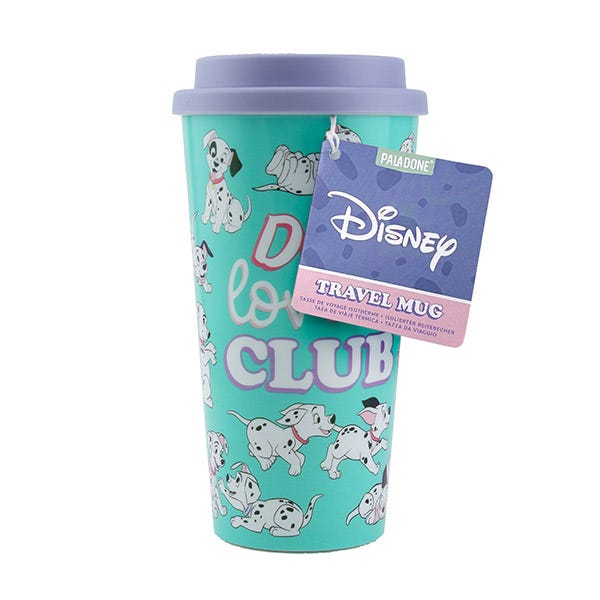 Este vaso de viaje reutilizable de plástico de los dálmatas tiene un hermoso acabado verde y está decorada con cachorros en la parte delantera.