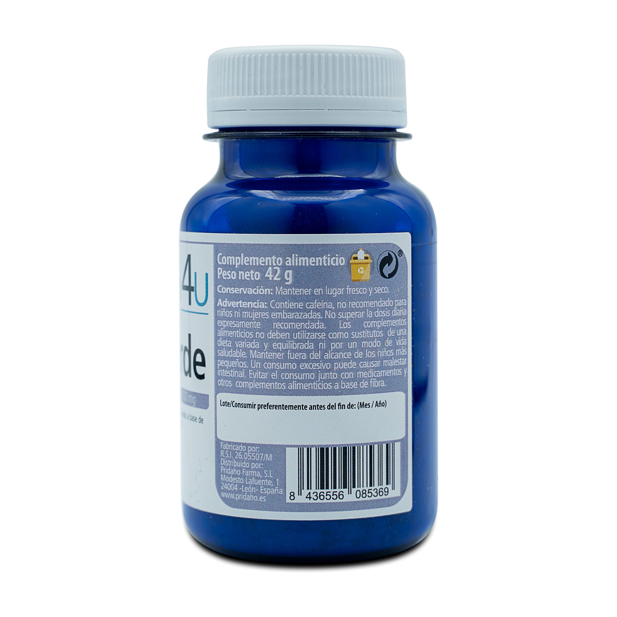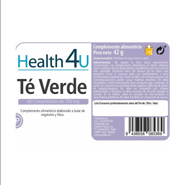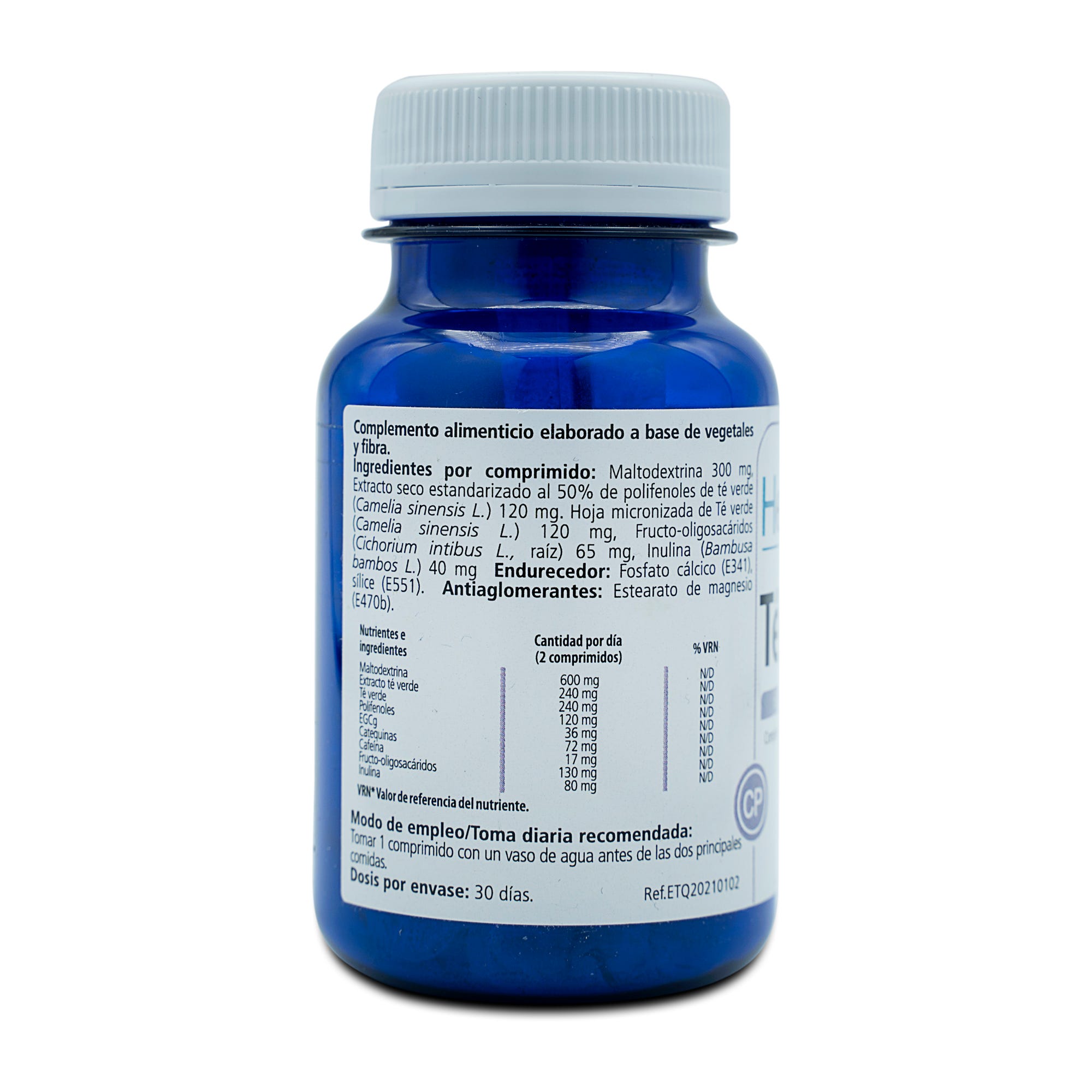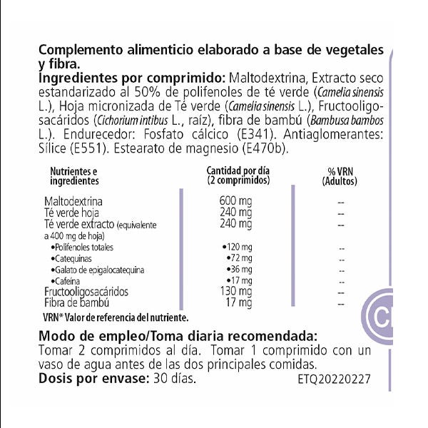 Ingrediente por compromido: Maltodextrina, Extracto seco estandarizado al 50% de polifenoles de té verde (Camelia sinensis L.) Hoja micronizada de Té verde (Camelia sinensis L.) Fructo-oligosacáridos (Cichorium intibus L., raíz) fibra de bambú ( Bambusa bambos L).