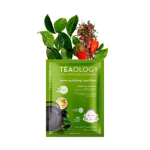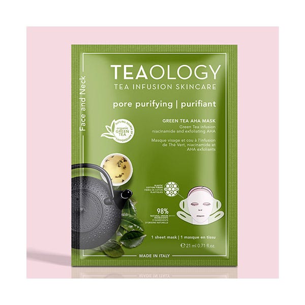 Mascarilla purificante para rostro y cuello en suaves fibras de algodón elásticas infundidas con té verde exfoliante, niacinamida y AHA.