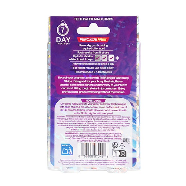 Nuestras tiras blanqueadoras Teeth Bright están diseñadas para vidas ocupadas y grandes resultados. Solo tienes que pegarlas y verás cómo las manchas rebeldes desaparecen en cuestión de minutos.