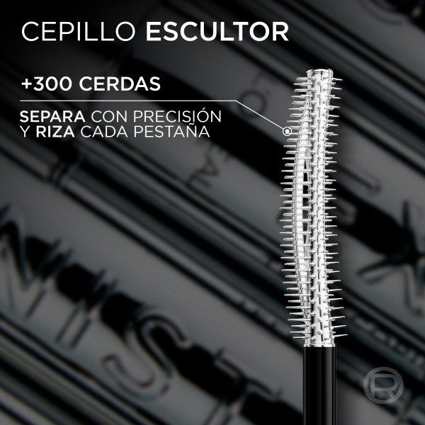 El cepillo para esculpir con más de 300 cerdas separa y riza cada pestaña con precisión para un aspecto definido y sin grumos que dura hasta 24 horas** (**Test de consumidores con 157 voluntarias).