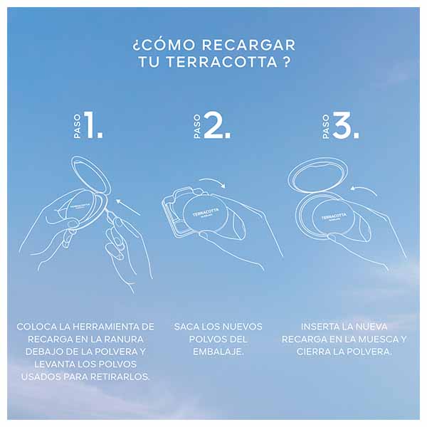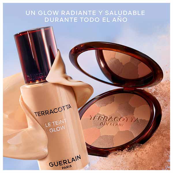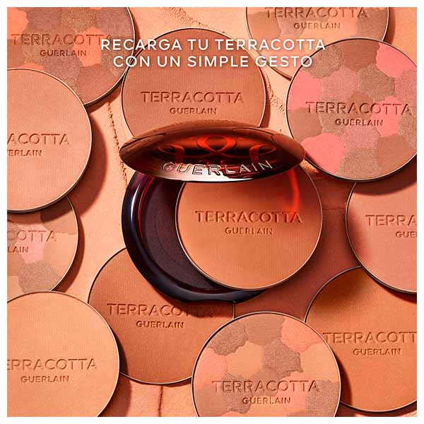 El perfume de los polvos Terracotta invita a la evasión. Las notas de ylang ylang y flor de naranjo envuelven en una agradable sensación. Se acompañan de notas de haba tonka y vainilla con soleadas facetas que encarnan la esencia de Terracotta.