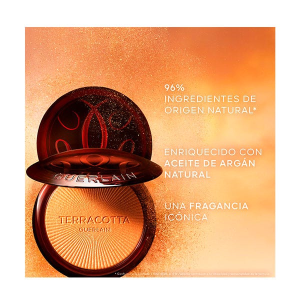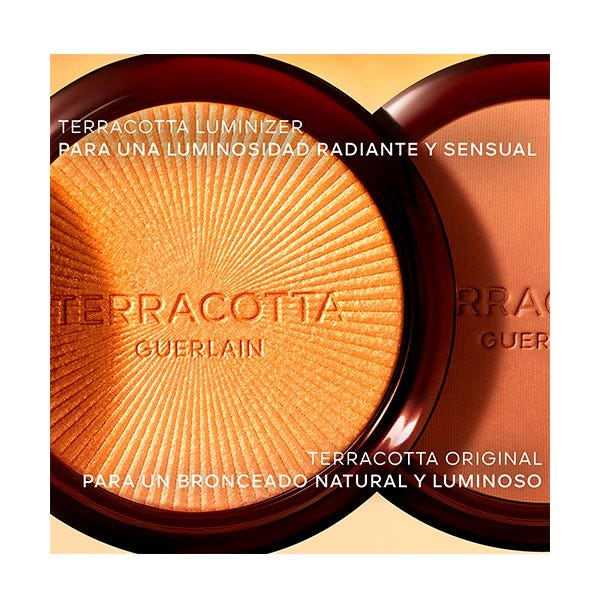 Los polvos iluminadores Terracotta Luminizer, una auténtica innovación en la gama de polvos para la tez de Guerlain formulada con un 96 % de ingredientes de origen natural¹, evocan la luz dorada del sol poniente con dos tonos resplandecientes: un marfil rosado y un oro dorado que garantizan un resultado deslumbrante y sensual.