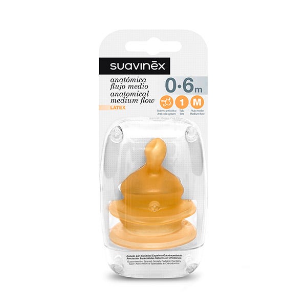 Pack 2 tetinas de biberón látex Suavinex. Tetina anatómica talla 1M. Diseñada para bebés de 0 a 6 meses y proporciona flujo medio (M), ideal para la leche, zumos y papillas muy líquidas. Para bebés 0-6 meses.