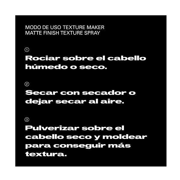 Rociar sobre el cabello húmedo antes de secarlo con secador para aportar fijación y crear texturas desenfadadas; o pulverizar sobre el cabello seco y moldear con las manos para conseguir una textura extrema y remoldeable.