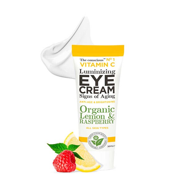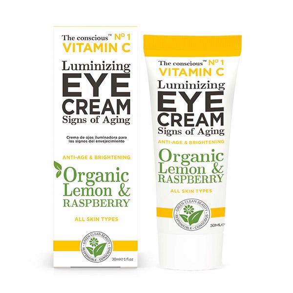 The conscious crema contorno de ojos luminosa antienvejecimiento con vitamina C, aceite de limón orgánico y hojas de frambuesa, hidrata y calma instantáneamente el contorno de ojos, la hinchazón y las arrugas alrededor de los ojos para lograr un cutis uniforme y un brillo más joven.