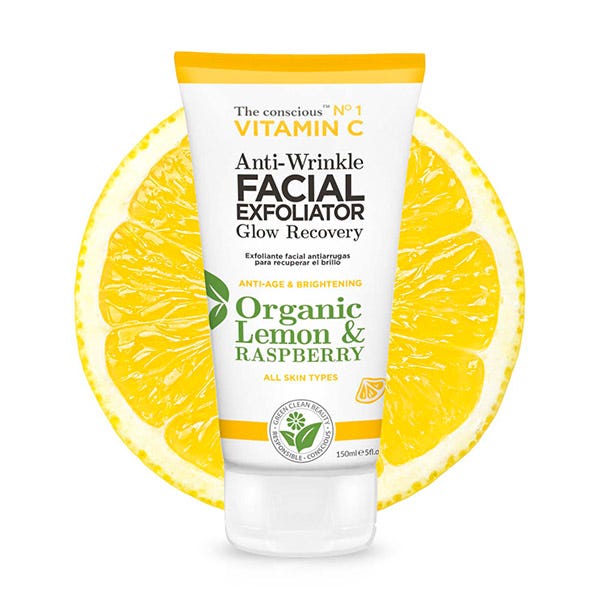 The conscious Exfoliante Facial Antiarrugas para la limpieza diaria con vitamina C antienvejecimiento, hojas orgánicas de limón y frambuesa que suavizan la piel y al mismo tiempo eliminan eficazmente la grasa y la suciedad, dejando la piel fresca y limpia con un brillo natural.