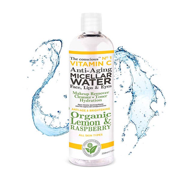 The conscious Agua Limpiadora Micelar Antienvejecimiento con Vitamina C que desafía el envejecimiento, limón orgánico y hojas de frambuesa elimina suavemente todos los rastros de maquillaje con facilidad, limpia, tonifica e hidrata para permitir que su piel naturalmente suave, brillante y resplandeciente resurja.