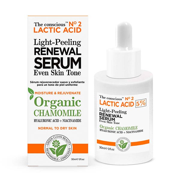 The conscious sérum facial de exfoliación ligera con ácido láctico, ácido hialurónico, niacinamida y manzanilla orgánica renueva, hidrata y suaviza la piel para ayudar a mejorar su textura y recuperar el resplandor de una piel joven.
