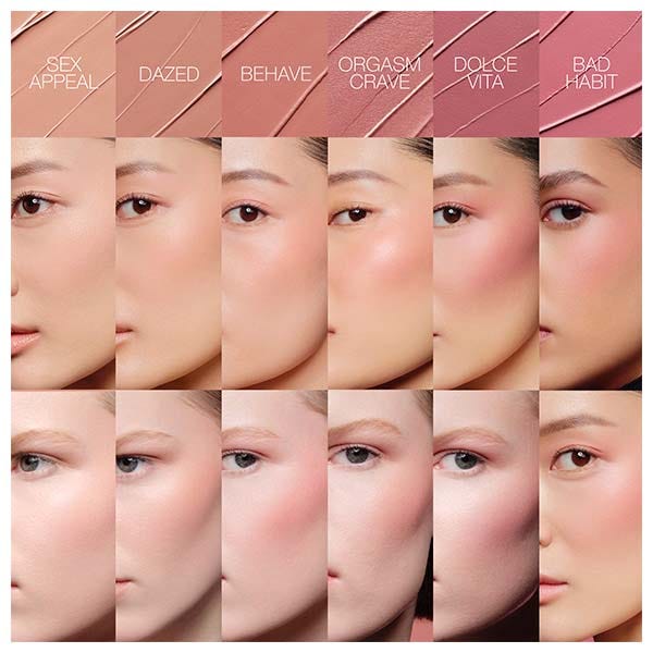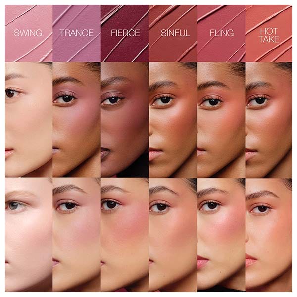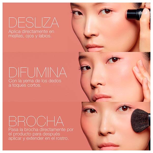 Aplica en mejillas, ojos y labios para un look monocromático. O unicamente en una de las areas para un color localizado.