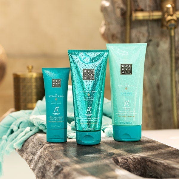 La textura de nieve del aftersun The Ritual of Karma refresca, calma y repara la piel con el complejo Hydra-Boost hidratante.