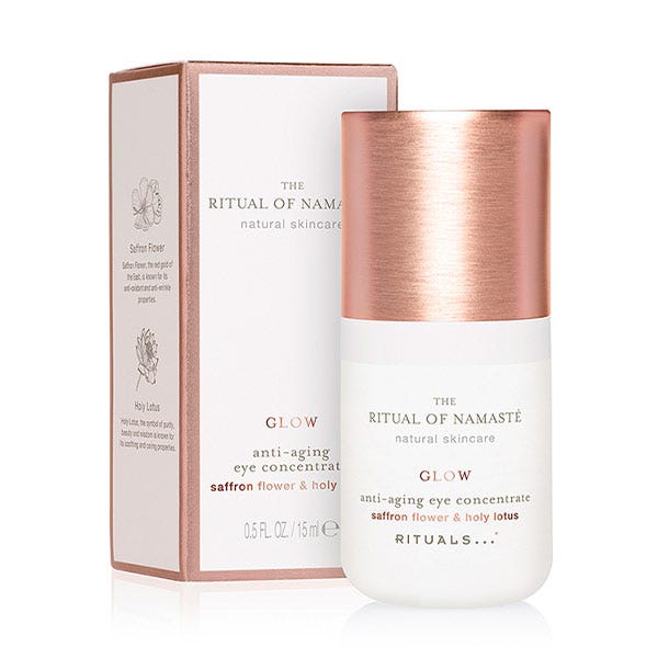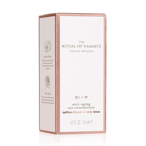 Como el resto de la línea Glow - Antiedad, el tratamiento concentrado para el contorno de ojos contiene ingredientes naturales, como la flor de azafrán, conocida por sus propiedades antioxidantes y antiarrugas.