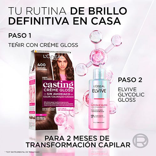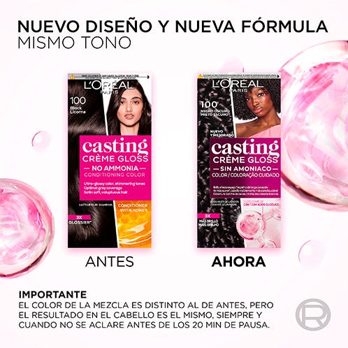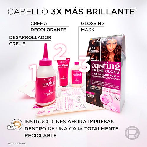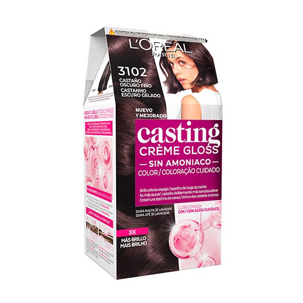 Casting Crème Gloss, la nueva generación de coloración sin amoniaco, transforma tu cabello con un brillo efecto espejo de larga duración. Su fórmula mejorada con Gloss Complex con Ácido Glicólico ofrece 3x más brillo, dejando el cabello 4x más suave y visiblemente más sano. Cubre las canas mientras aporta reflejos luminosos y un color vibrante que dura hasta 32 lavados. Tinte de fácil aplicación.