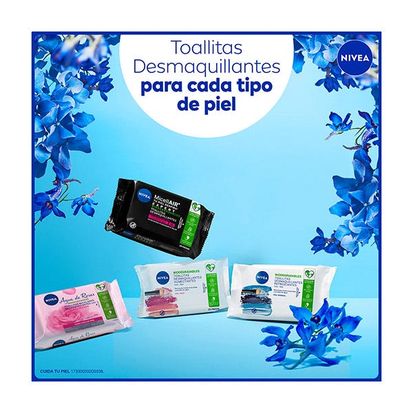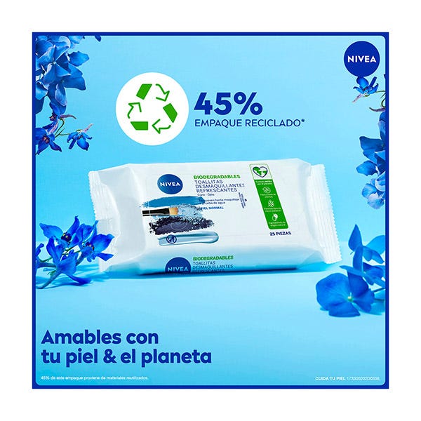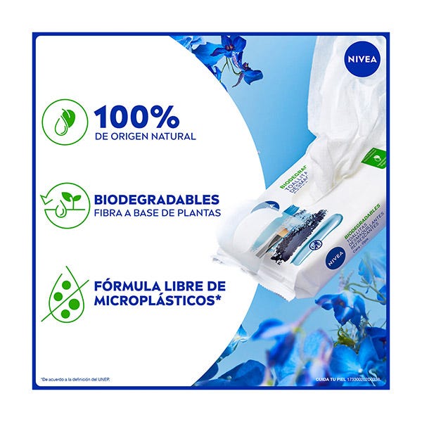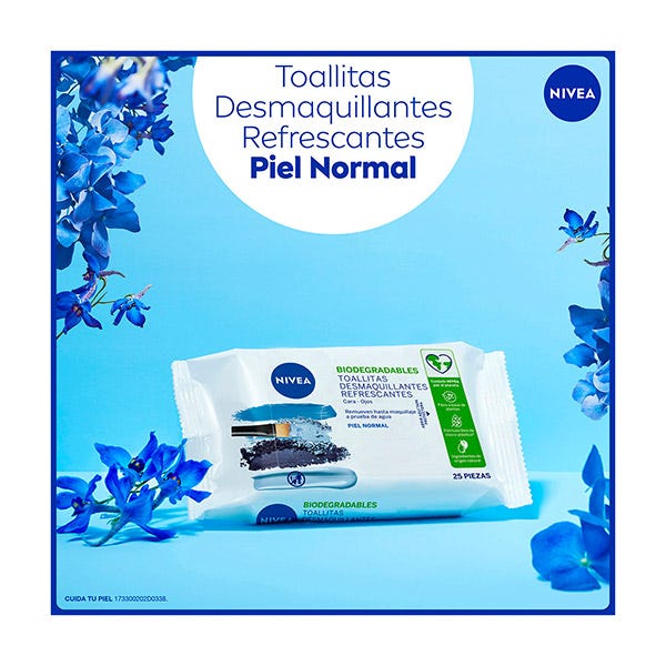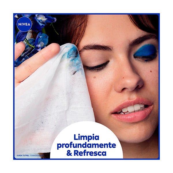 NIVEA Toallitas Desmaquilladoras Biodegradables Refrescantes 3en1 para piel normal o mixta eliminan eficazmente incluso el maquillaje y la máscara de pestañas waterproof, dejando la piel limpia y con sensación de frescor. Fórmula especialmente desarrollada para ser suave con la piel y el delicado contorno de los ojos. Fórmula con 0% alcohol y Extracto de Flor de Loto que limpia, hidrata y refresca la piel. Compatibilidad con la piel y los ojos dermatológica y oftalmológicamente comprobada.