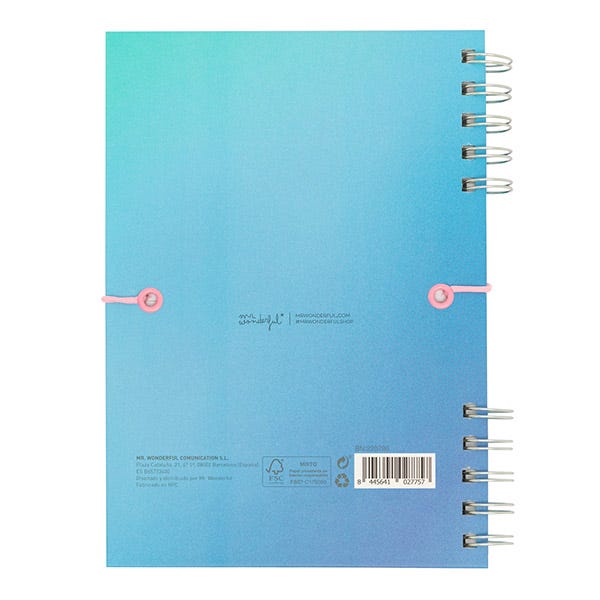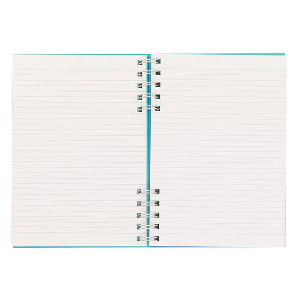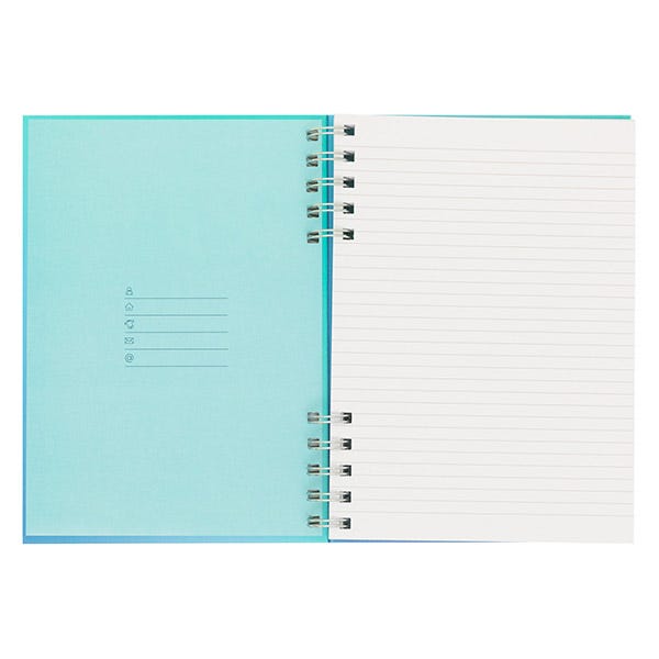 - Libreta azul tamaño A5 con encuadernación en espiral. Esta espiral está dividida en dos partes, lo que le aporta originalidad.