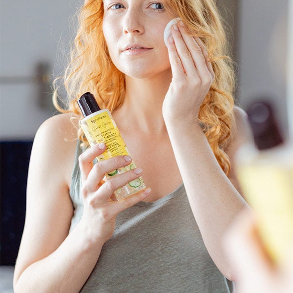 Empapar un algodón con el tónico y pasarlo por el rostro, cuello y escote, evitando el contorno de los ojos.