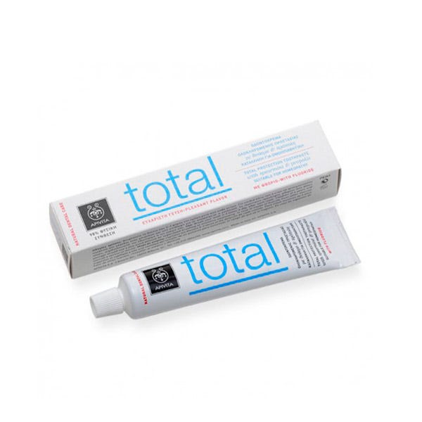 Apivita Total previene la formación de placa y ayuda a proteger contra la caries y la gingivitis con extractos de propóleo y salvia, flúor y una mezcla de aceites de menta, limón, mirra y eucalipto.