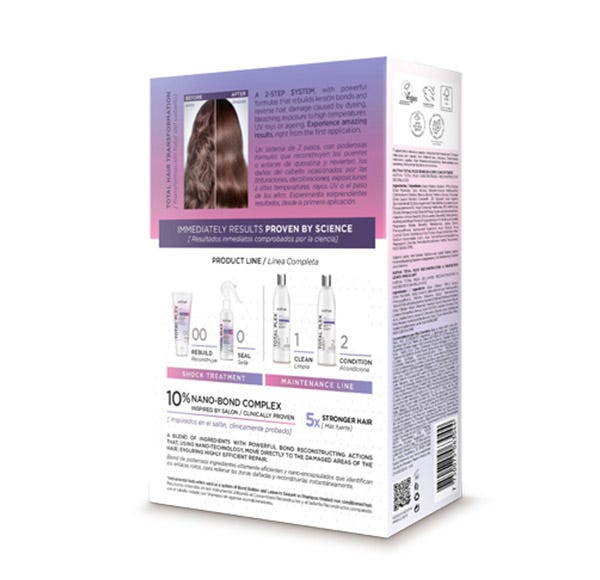 Un sistema de dos pasos con poderosas fórmulas que reconstruyen los enlaces de queratina y revierten los daños del cabello ocasionados por las tinturaciones, decoloraciones, exposiciones a altas temperaturas, rayos UV o el paso de los años.