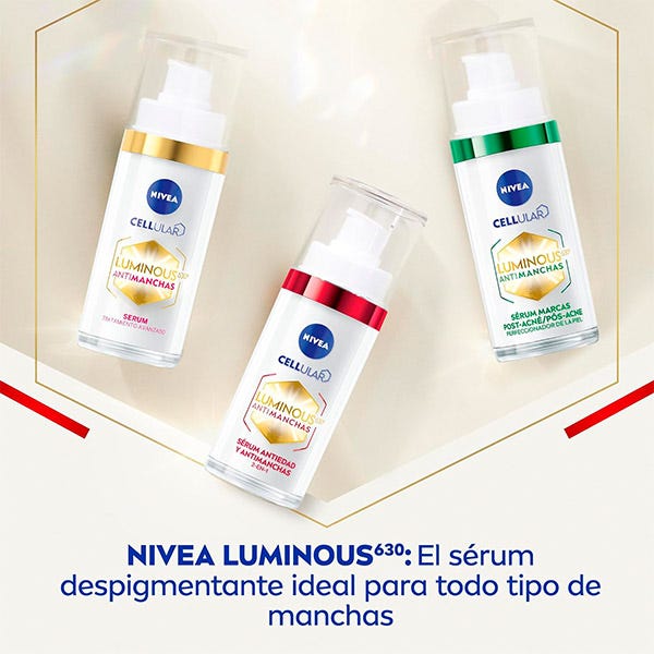 NIVEA Luminous 630 Sérum Antimanchas y Antiedad: Aqua, Glycerin, Caprylic/Capric Triglyceride, Cocoglycerides, Methylpropanediol, Glyceryl Stearate, Cetearyl Alcohol, Distarch Phosphate, Tapioca Starch, Butyrospermum Parkii Butter, Cetyl Palmitate, Squalane, Isobutylamido Thiazolyl Resorcinol, Glycine Soja Germ Extract, Sodium Hyaluronate, Sodium Stearoyl Glutamate, Ethylhexylglycerin, Xanthan Gum, Trisodium EDTA, Sodium Chloride, Phenoxyethanol, Parfum.