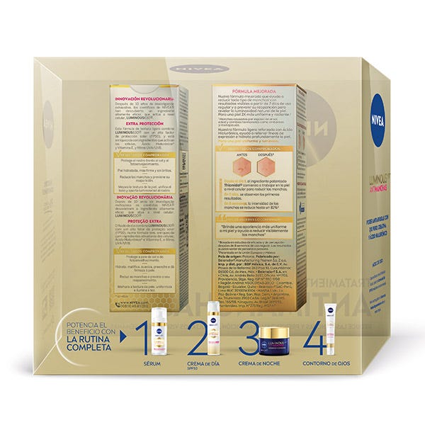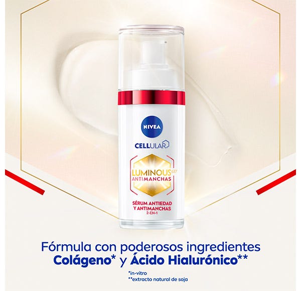 LUMINOUS630 ANTIMANCHAS CREMA DE DÍA SPF50: NIVEA Cellular Luminous630 Antimanchas Crema de día SPF50, es una fórmula extra protectora y de textura ligera que combina el ingrediente altamente eficaz LUMINOUS630® con un alto factor de protección solar (SPF50), y está enriquecida con Ácido Hialurónico, Vitamina E y filtros UVA/UVB.