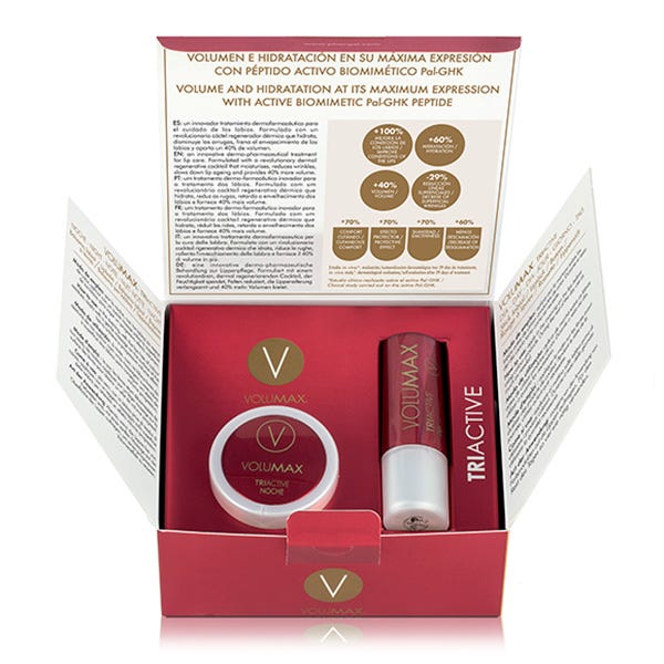 Tratamiento completo de labios que además de hidratar, reparar y suavizar tus labios, realza tu volumen en tan solo 29 días. El tratamiento combinado Dia/Noche de Volumax Triactive disminuye las líneas de expresión, regenera y repara la piel consiguiendo unos labios ultrahidratados, más lisos y jugosos. Además, aumenta de forma progresiva y natural el volumen de tus labios, redensificandolos.