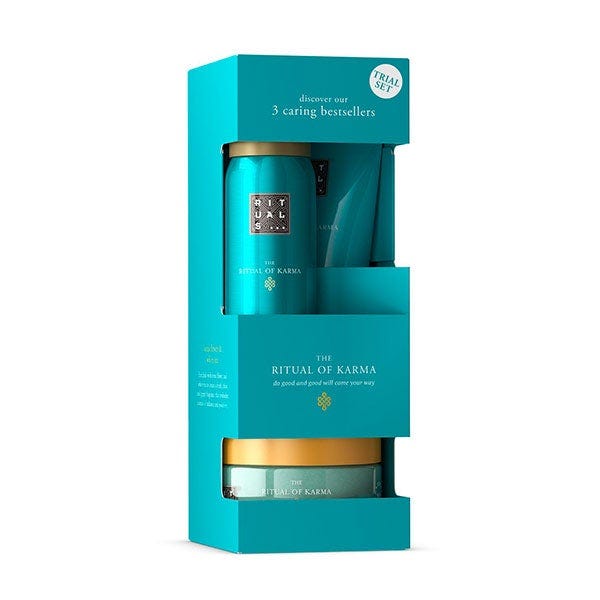 El set de prueba The Ritual of Karma contiene una espuma de ducha, una crema corporal y un exfoliante corporal.