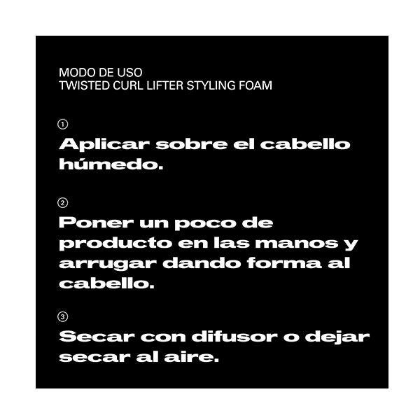 Aplicar la espuma de styling sobre el cabello húmedo de forma ascendente con las manos para definir los rizos. Secar con difusor o al aire libre.