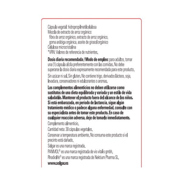 PANMOL B-COMPLEX de brotes de quinoa, Niacina (nicotinamida) 12mg, Ácido pantoténico (D-pantotenato cálcico) 3,75mg, Vitamina B6 (clorhidrato de piridoxina) 1,27mg, Vitamina B2 (riboflavina-5-fosfato sódico) 0.97mg, Vitamina B1 (clorhidrato de tiamina) 0.9mg, Ácido fólico 150µg, Biotina (D-biotina) 22.5µg, Vitamina B12 (cianocobalamina) 1.8µg, Rhodiolife extracto estandarizado de raíz de rodiola (Rhodiola rosea)(2mg [1% ] salidrosidos, 6mg [3%] rosavinas) 200mg.