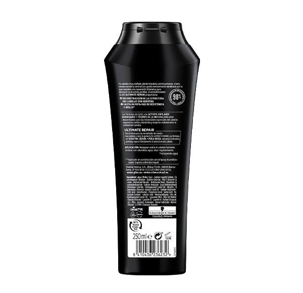 Ultimate repair: Este champú para cabellos dañados rellena con precisión las queratinas perdidas y repara intensamente la estructura capilar, ayudando a combatir la estructura debilitada del cabello.