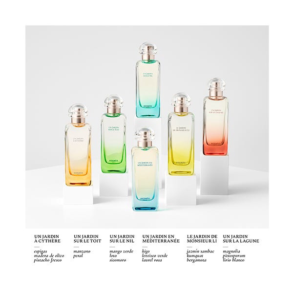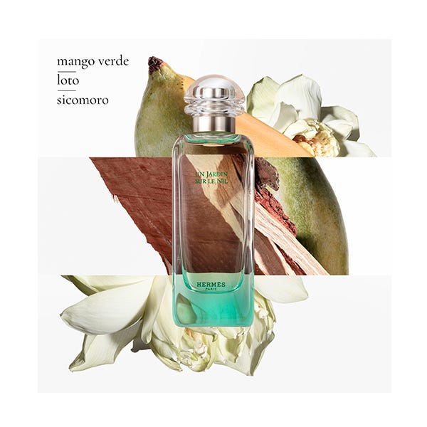 Esta fragancia es un jardín rebosante de vida, generoso y chispeante, donde los aromas del mango verde, la flor de loto y el cálamo aromático se entremezclan con las notas de incienso y madera de sicomoro.