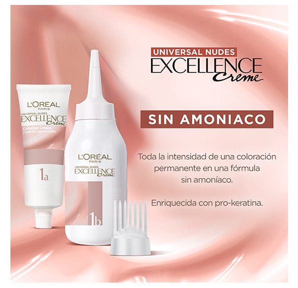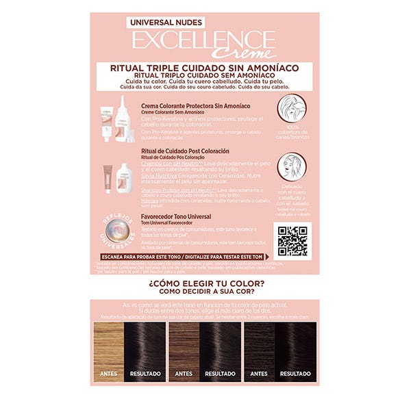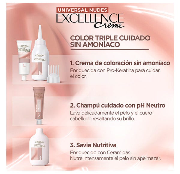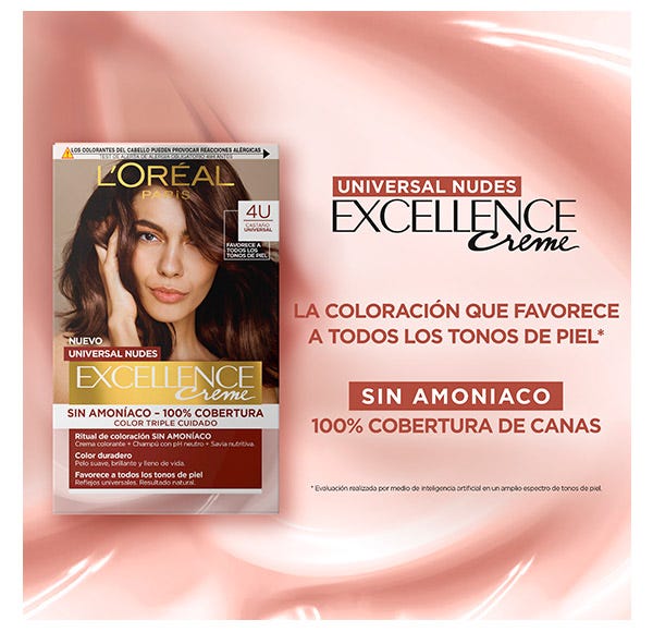 Excellence Universal Nudes cuenta con una extensa paleta de 10 tonos universales que favorecen a todos los tonos de piel*. Su fórmula Triple Cuidado protege el cabello antes, durante y después de la coloración