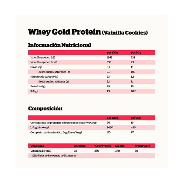 Nuevo Whey Gold Protein con DigeZyme® con los benefeicios de siempre y, además, enriquecido con DigeZyme®. Whey Gold Protein es una proteína de suero de leche de máxima calidad, compuesta únicamente por concentrado de suero lácteo (WHEY). Es perfecta para después del entrenamiento, pues contribuye a la conservación o aumento de la masa muscular gracias a su rápida absorción.