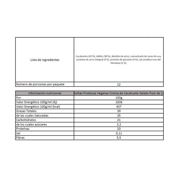 Cacahuetes (43%), dátiles (38%), almidón de arroz, concentrado de zumo de uva, proteína de arroz integral (4 %),proteína de guisantes (4%), sal cristalina rosa del Himalaya (1%).