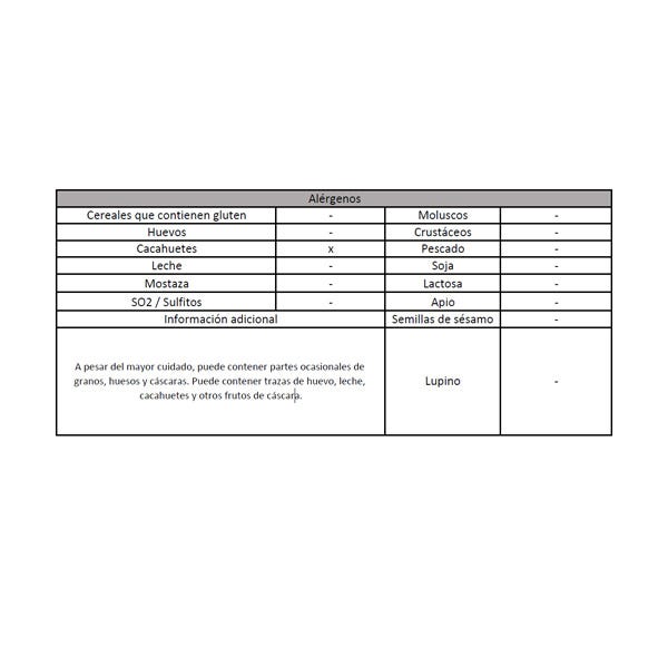 A pesar del mayor cuidado, puede contener partes ocasionales de granos, huesos y cáscaras. Puede contener trazas de huevo, leche, cacahuetes y otros frutos de cáscara.