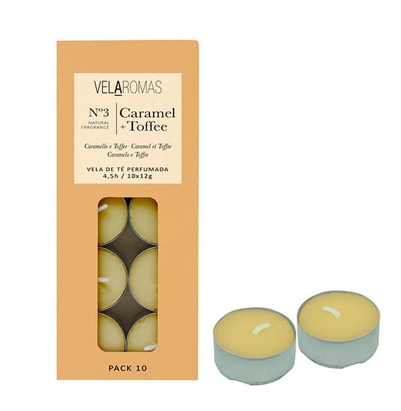 Pack de 10 minivelas con fragancia caramelo toffee.
