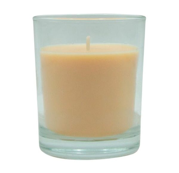 Vela de cera vegetal con fragancia Chai Latte. Presentada en vaso de cristal 100% reciclable.
