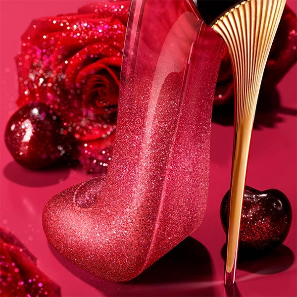 Very Good Girl Glam Parfum ofrece una intensa nota superior a cereza en un brillante frasco en forma de zapato de tacón de color rojo-cereza intenso empapado en una deslumbrante y glamurosa cascada de brillos. El agua de rosas amplifica la nota central de la fragancia elevándola de eau de parfum a perfume intenso, mientras que el final a vetiver y vainilla Bourbon, obtenidos de forma sostenible, intensifica su profundidad y contraste.