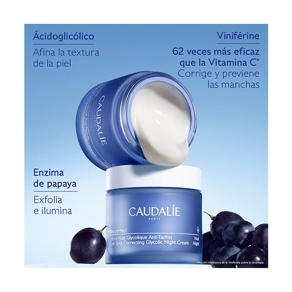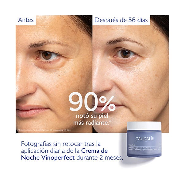 La Crema Noche Glicólica Antimanchas Vinoperfect corrige las manchas y actúa como un peeling suave durante la noche para lucir una piel fresca y luminosa al despertar.