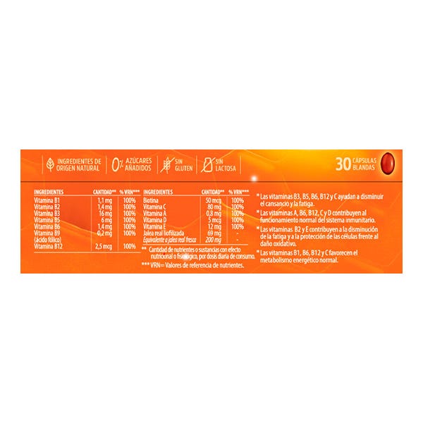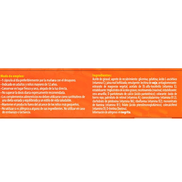 Aceite de girasol; agente de recubrimiento: glicerina; gelatina; acido L-ascorbico (vitamina C); jalea real liofilizada: emulgente: lectina de soja; antiaglomerante: estearato de magnesio vegetal; acetato de DL-alfa-tocoferilo (vitamina E); estabilizante: triglicéridos de ácidos grasos; nicotinamida (niacina); estabiliante: cera amarilla; D-pantotenato de calcio (acido pantoténico);colorante: óxido de hierro rojo; palmitato de retinol (vitamina A );cianocobalamina(vitamina B12);clorhidrato de piridoxina(vitamina B6); riboflavina (vitamina B2); mononitrato de tiamina (vitamina B1); folato (acido pteroilmonoglutamico);colecalciferol (vitamina D); d-biotina(biotina)