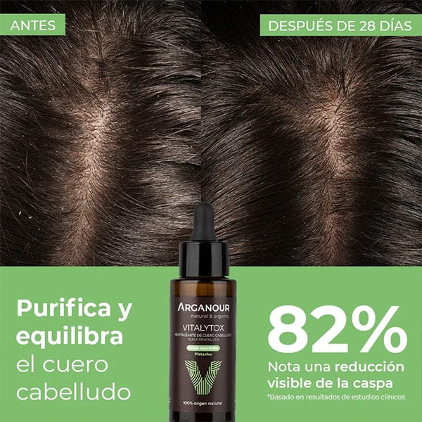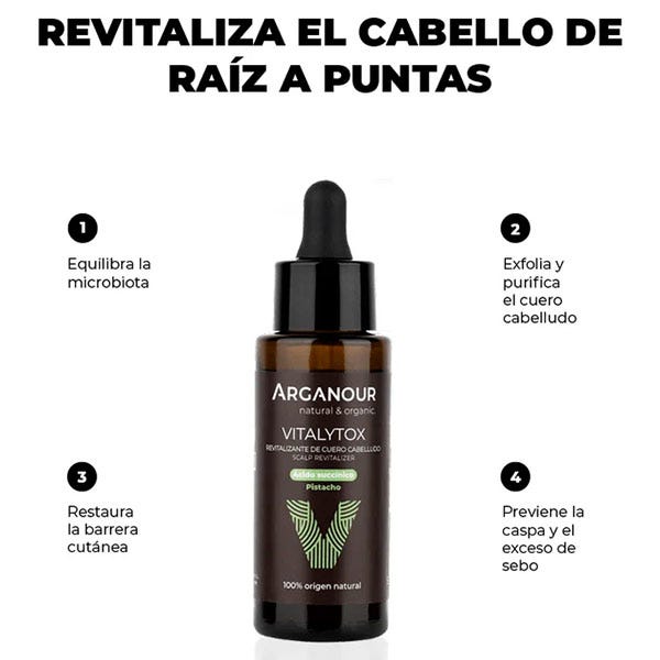 Vitalytox combina ácido succínico para purificar el cuero cabelludo y eliminar las células muertas e impurezas que puedan obstruir los folículos pilosos; extracto de anís para prevenir el estrés oxidativo, la caspa y el exceso de sebo, ayudando así a reducir la inflamación; y, extracto de pistacho para hidratar y mejorar la función barrera.