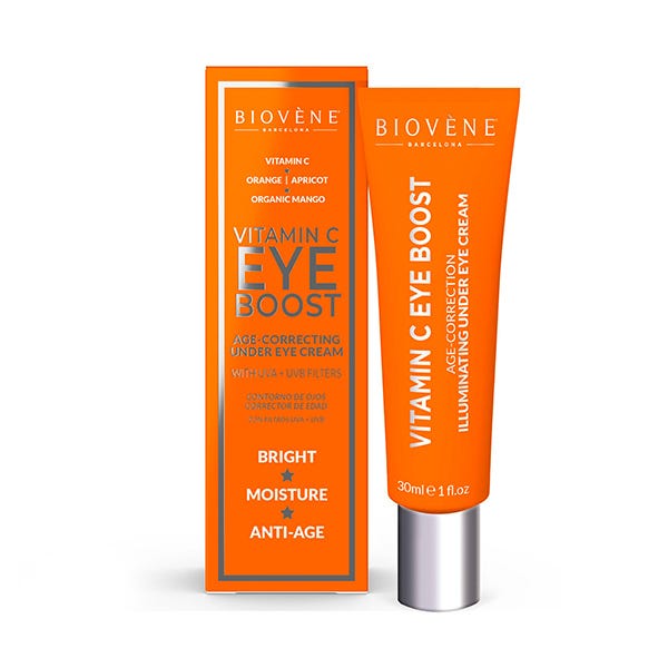 Tratamiento contorno de ojos EYE BOOST hidratante de día y noche corrector de edad para el rejuvenecimiento de la piel debajo de los ojos con vitamina C y mango orgánico que ayuda a minimizar la aparición de ojeras, líneas finas y refresca la piel cansada.